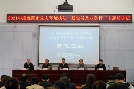 (通讯员 曾子颖)4月20日上午,由襄阳市生态环境局主办、十大电子正规官网培训学院承办的“2021年度襄阳市生态环境执法一线党员及骨干专题培训班”顺利开班。襄阳市生态环境局党组书记、局长蔡金海,党组成员、副局长王祖庆,四级调研员、人事科科长李发兴,澳门十大电子正规游戏网站培训学院院长、经济学教授张来斌等出席开班仪式。开班仪式由培训学院副院长王炜主持。