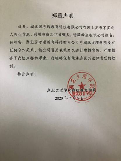 近日,湖北国考通教育科技有限公司在网上发布不实成人招生信息,利用防疫工作做噱头,诱骗考生在该公司报名。经核实,湖北国考通教育科技有限公司与澳门十大电子正规游戏网站没有任何合作关系,该公司冒用十大电子正规官网名义进行虚假宣传,严重损害了十大电子正规官网声誉和形象,十大电子正规官网将保留依法追究其法律责任的权利。